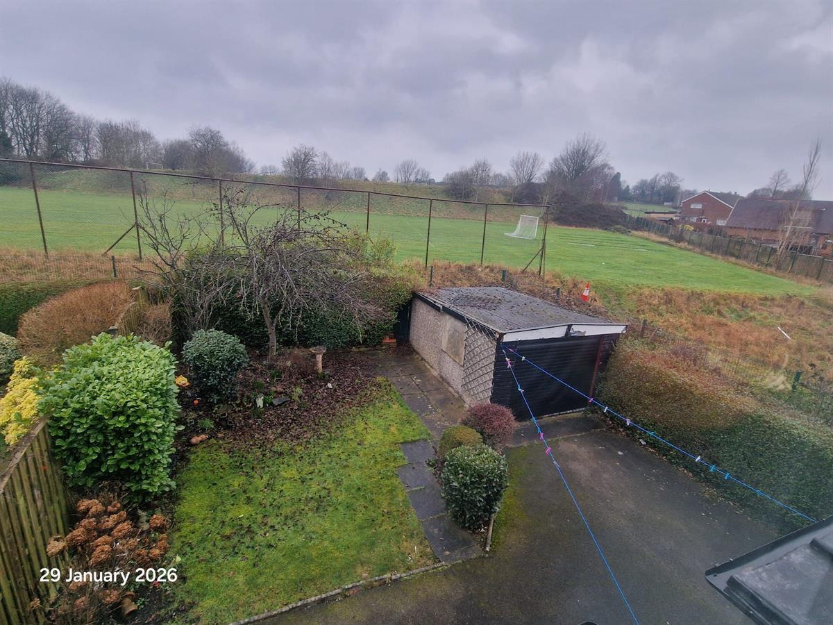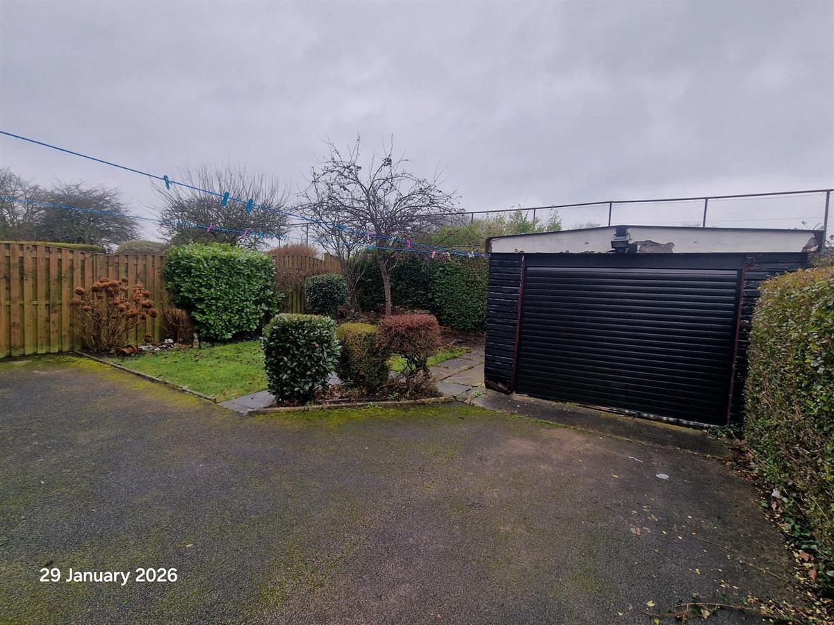 The property is set back with a neat front lawn and driveway providing off-street parking, leading to a detached garage. To the rear, the garden enjoys a pleasant outlook over open green space, offering a good degree of privacy.