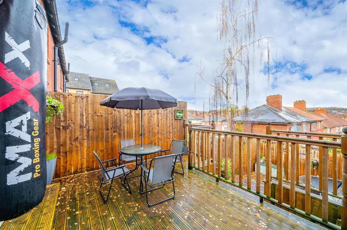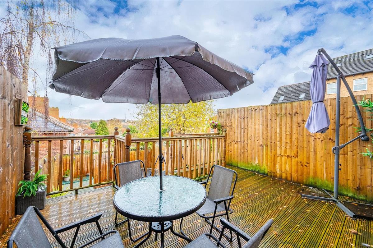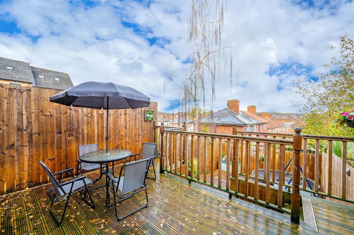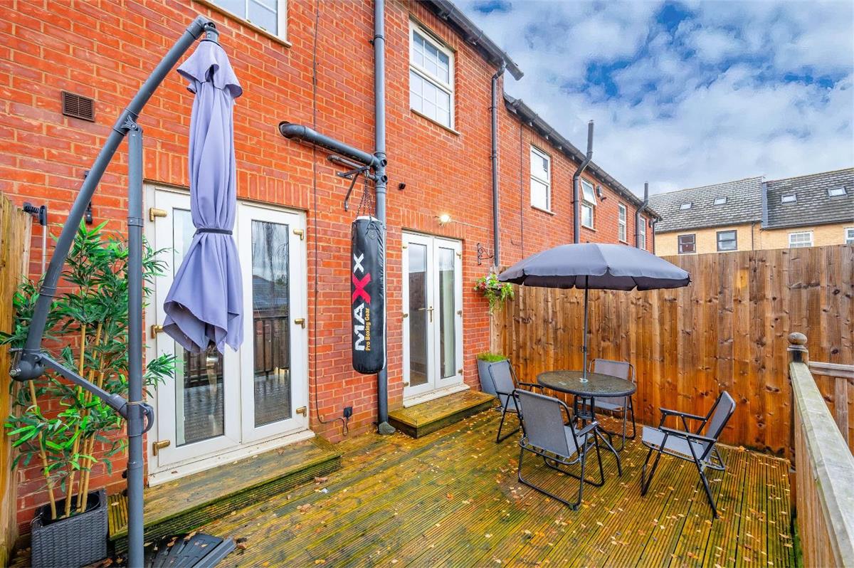 The ground floor features a bright and spacious open-plan lounge and kitchen, creating a fantastic living and entertaining space. Two sets of double French doors lead directly onto the low-maintenance rear garden, which benefits from a recently fitted decking area and a lower section finished with decorative stone, perfect for outdoor seating and relaxing. A convenient downstairs WC completes the ground floor.
